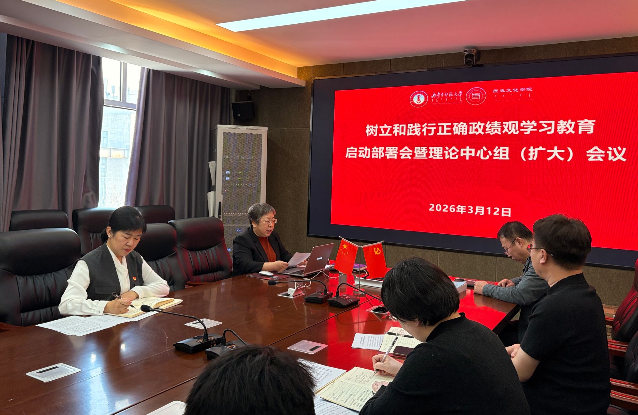 3月12日下午,历史文化学院在盛乐校区学院楼502会议室召开党委(扩大)会暨树立和践行正确政绩观学习教育启动部署会。学院党委委员、各党支部书记参加会议,会议由学院党委书记李艳洁主持。