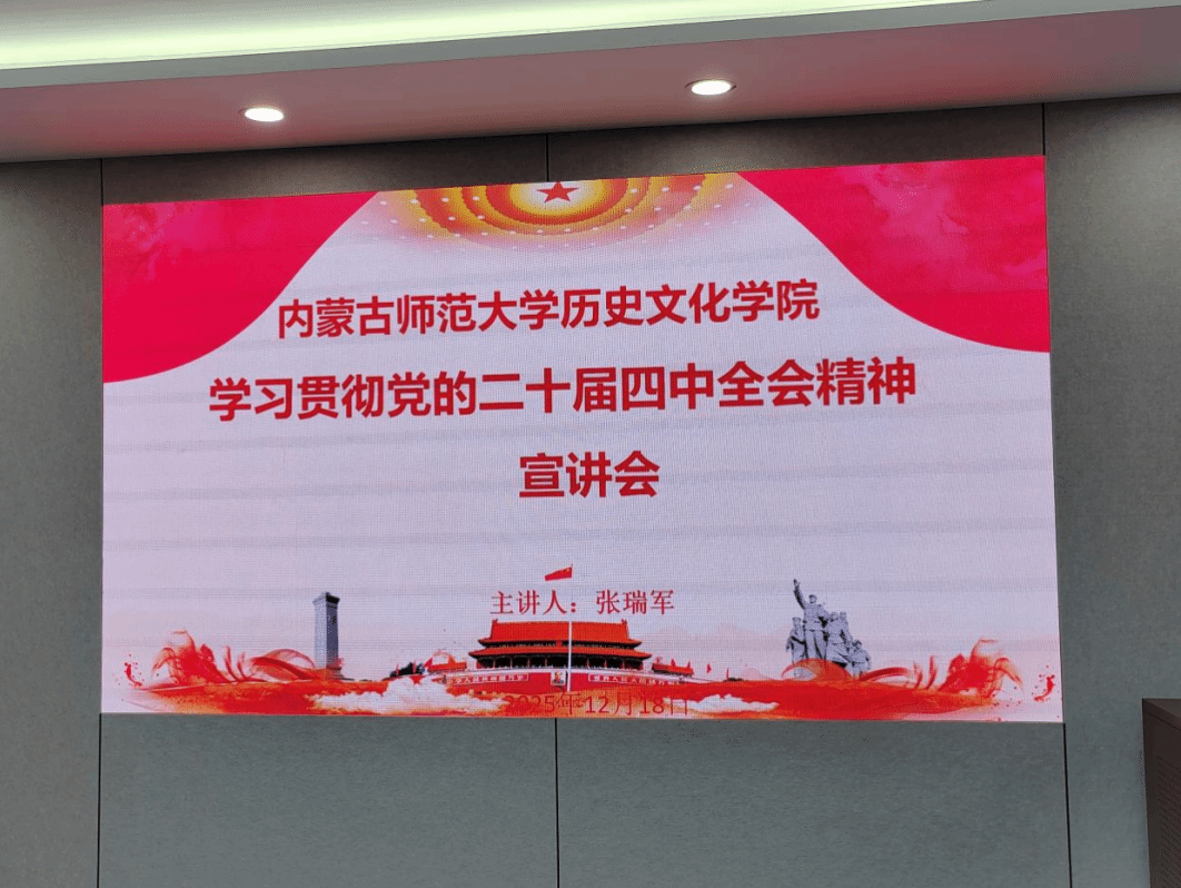 为深入学习贯彻党的二十届四中全会精神,引导全院教职工准确把握国家发展大局与时代要求,2025年12月18日下午,历史文化学院在赛罕校区学术交流中心3号会议室组织召开专题宣讲会。会议邀请自治区思想政治中青年骨干团队成员、思想政治理论课名师工作室成员、我校中共党史与党建学院院长张瑞军教授,作题为《深学笃行四中全会精神,接续推进中国式现代化》的专题报告。学院领导班子成员及全体教职工参加了学习。